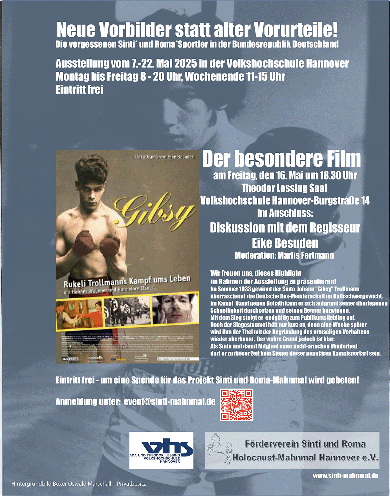 Uns ist es außerdem gelungen, für das weitere Programm der Ausstellung am 16. Mai um 18.30 Uhr im Theodor-Lessing -Saal der VHS das großartige Dokudrama „ Gibsy – Rukeli Trollmanns Kampf ums Leben“ mit Hannes Wegner und Hannelore Elsner präsentieren zu können. Der Regisseur Eike Besuden wird an dem Abend anwesend sein und freut sich auf die Diskussion zum Film und dem Schicksal Rukeli Trollmanns. Eine gesonderte Einladung für dieses Event folgt in den nächsten Tagen!