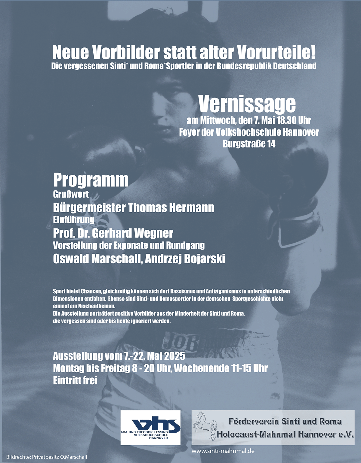 Trollmann wurden in der Ausstellung Sportler vorgestellt, die trotz internationaler Karriere zumeist wieder vergessen sind oder die wegen ihrer Zugehörigkeit zu den Sinti und Roma nicht den erhofften Erfohg hatten. Zur Ausstellungseröffnung stellte Oswald Marschall die Probleme und subtilen Diskriminierungen dar, denen er in seiner Boxer-Karriere ausgesetzt war und die mit ein Anstoß war, die Ausstellung zusammen mit Andrzej Bojarski zu realisieren. Bürgermeister Thomas Hermann und der Antisemitismusbeauftragte Dr. Gerhard Wegner hielten die Eröffnungsansprachen.